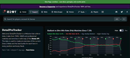 Дота 2 про трэкер остается одним из ключевых аналитических сервисов сегодня. По своему принципу – это агрегатор, который собирает данные о матчах и подает их в структурированной форме. На сервисе появилось несколько дополнительных инструментов, при этом интерфейс кардинально не поменялся. Ключевым же изменением в работе сервиса стало ограничение на сбор данных о матчах с 8500 MMR. При этом некоторая информация о высокоранговых катках на сайте все же присутствует.